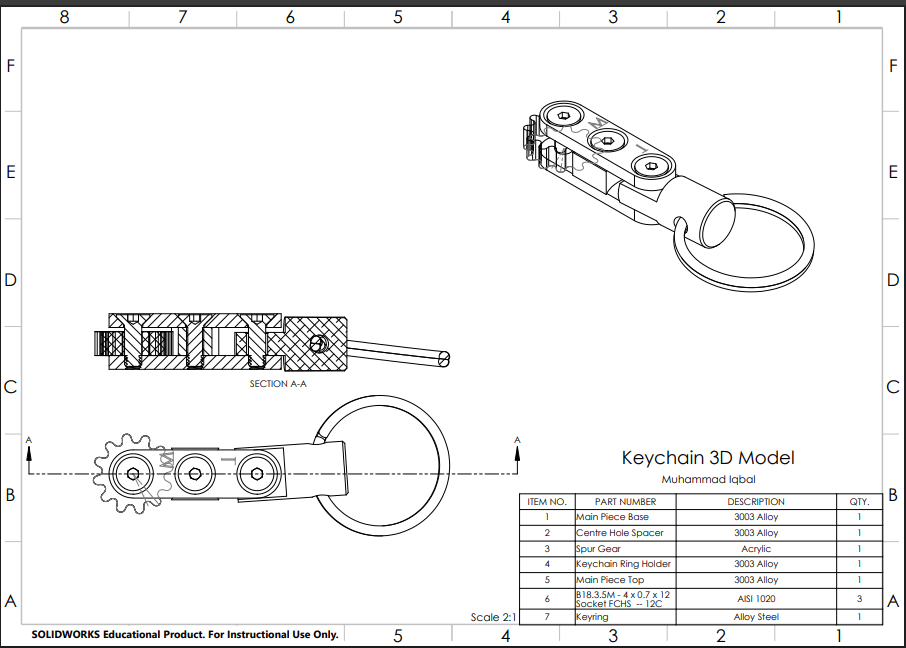 Designed a multi-part aluminum keychain assembly in SolidWorks, modeling individual components with appropriate clearances for assembly and motion. Generated detailed engineering drawings and planned machining steps to ensure features could be produced accurately using available shop equipment.