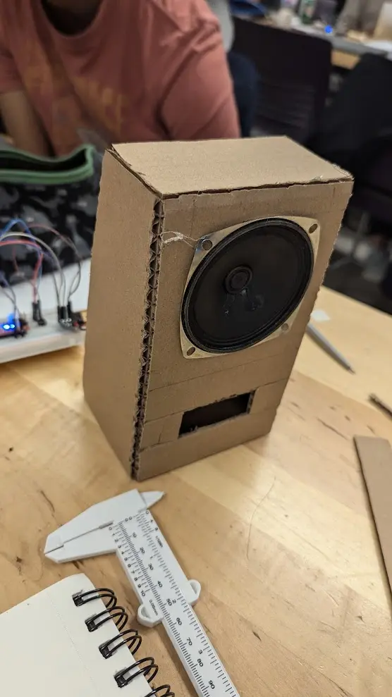 Designed and constructed a custom cardboard speaker enclosure to improve acoustic projection and resonance within rapid prototyping constraints. Evaluated enclosure geometry and material effects on sound amplification, reinforcing the role of mechanical design in system-level performance.