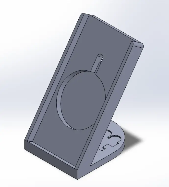 Modeled the stand in CAD with a precisely dimensioned circular cutout to achieve a snug, repeatable fit for the charging pod while maintaining correct charging alignment. Incorporated appropriate wall thicknesses and angles to support the phone securely during use, balancing printability with structural rigidity.