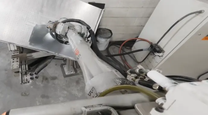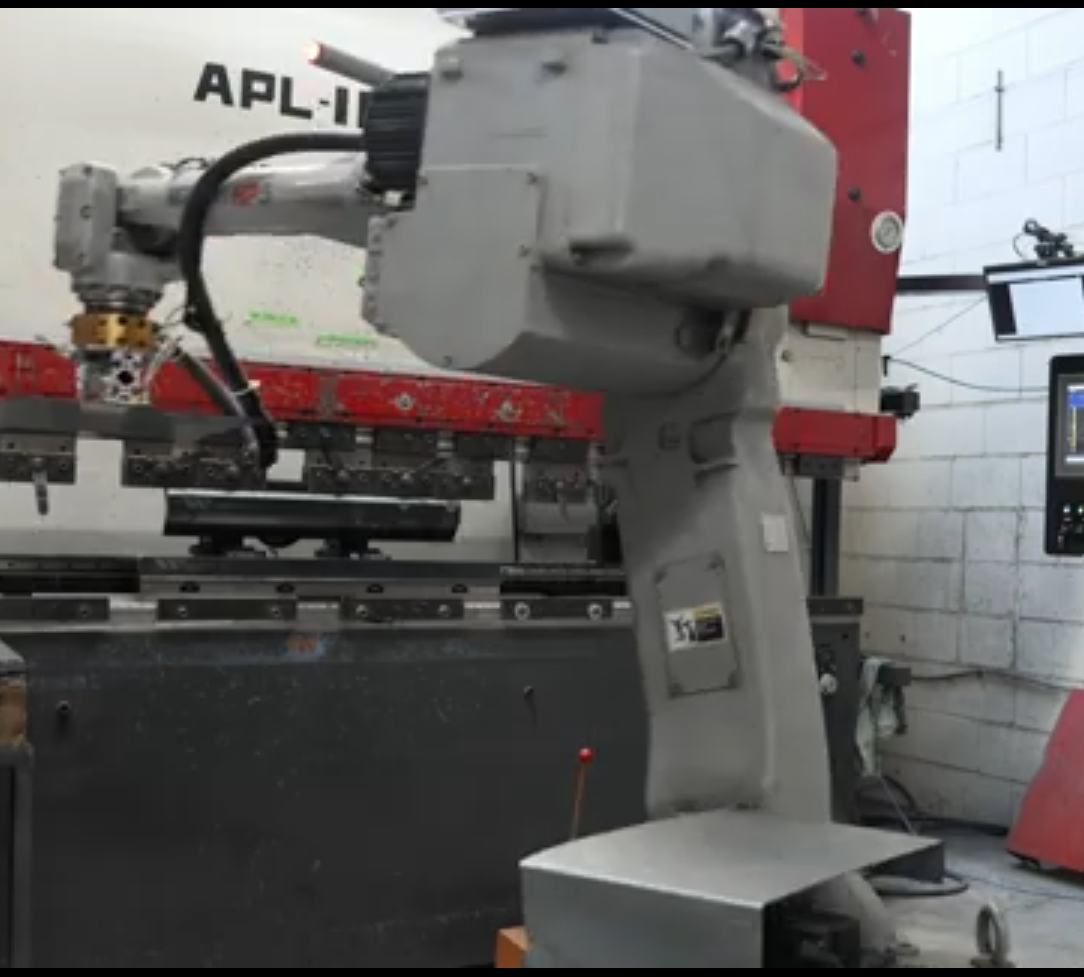 Integrated the robot with a press brake operating in robot mode, including signaling for each forming operation. Programmed coordinated pickup and placement using a custom vacuum gripper designed for aluminum parts. Manually defined collision-free paths in a constrained workspace with minimal sensing, requiring careful control of approach angles, clearances, and part orientation throughout the forming cycle.